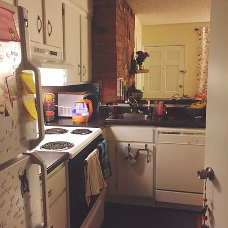 The kitchen is not its own room, rather a continuation of the living space divided by a small counter bar. The countertops are a dark grey and the cabinets are painted a bright white. The sink and dishwasher are under the bar and the stove and refrigerator run along the same wall as the fireplace.