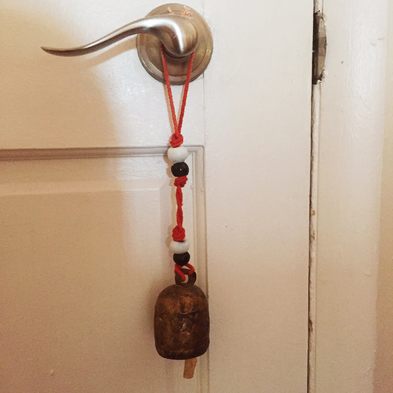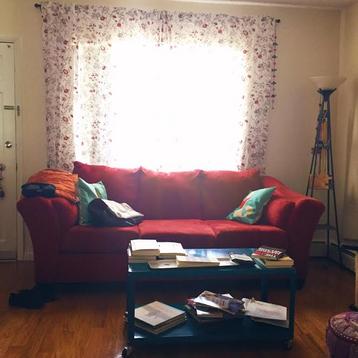 The living area of the apartment is compact. There is a red couch with an orange blanket across the arm directly to the left of the front door when you walk in. There is a cowbell on the door that clangs every time it is open and shut. In front of the couch is a metal, turquoise coffee table. On it is a long tray with cartoon birds, it is empty.